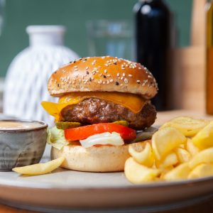 Burger cu salată coleslaw, cartofi prăjiți și sos thousand island